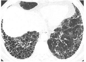 肺線維症は肺の高度の線維化が慢性かつ確実に進行する、非常に予後不良な不可逆性の間質性肺炎です。癌と変わりない予後だともいわれ、指定難病に位置付けられています(2)。この肺の高度線維化に伴う陰影はUIPパターンと呼ばれ、胸部CTで肺底部(横隔膜あたり)から背中にかけての蜂巣肺(ハチの巣状のボコボコした影)や網状影が特徴とされます。